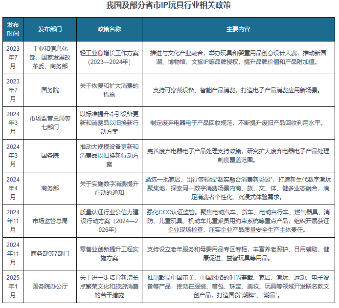为促进IP玩具行业的发展,我国及部分省市发布了多项行业政策,比如工业和信息化部、国家发展改革委、商务部发布的《轻工业稳增长工作方案(2023—2024年)》;国务院办公厅发布的《关于进一步培育新增长点繁荣文化和旅游消费的若干措施》。