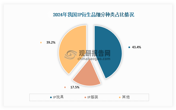 IP玩具是IP衍生品的一种。具体来看,在2024年IP衍生品市场中IP玩具占比到到了43.4%;而IP服装占比为17.5%。