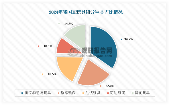 从细分种类来看,我国IP玩具行业中占比最高的为拼搭和组装玩具,市场规模为268亿元,占比为34.7%;其次为静态玩偶,市场规模为117亿元,占比为21.99%;第三为毛绒玩具,市场规模为143亿元,占比为18.5%。