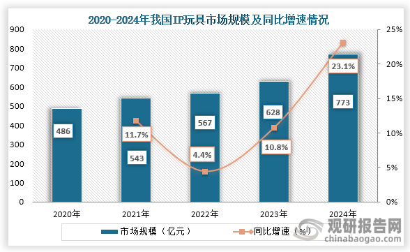 我国IP玩具市场规模来看,2020年到2024年我国IP玩具市场规模持续增长,到2024年我国IP玩具行业市场规模为773亿元,同比增长21.3%。